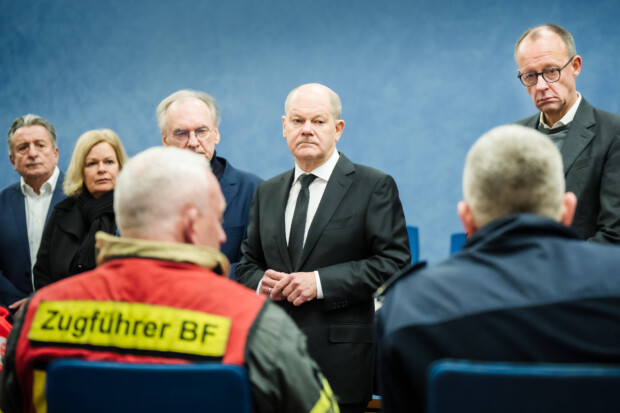 Magdeburg, Sachsen-Anhalt, Deutschland, 21.12.2024: Alter Markt: Anschlag auf Magdeburger Weihnachtsmarkt: Spitzenpolitiker besuchen den Tatort und sprechen mit Einsatzkräften. L-R: Sachsen-Anhalts Landtagspräsident Gunnar Schellenberger CDU, Bundesministerin des Innern und für Heimat Nancy Faeser SPD, Ministerpräsident Reiner Haseloff CDU, Bundeskanzler Olaf Scholz SPD, CDU-Chef Friedrich Merz *** Magdeburg, Saxony-Anhalt, Germany, 21 12 2024 Old Market Attack on Magdeburg Christmas Market Top politicians visit the crime scene and talk to emergency services L R Saxony-Anhalt State Parliament President Gunnar Schellenberger CDU , Federal Minister of the Interior and for Homeland Nancy Faeser SPD , Minister President Reiner Haseloff Copyright: xJescoxDenzel/BPA/dtsxNachrichtenagenturx dts_54492