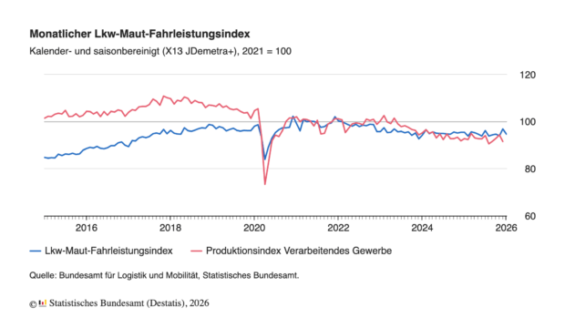 Der Lkw-Maut-Fahrleistungsindex, ein zuverlässiger Frühindikator für industrielle Aktivität, bestätigt, dass es im Januar 2026 weiter abwärts geht. Die Fahrleistung mautpflichtiger Lkw auf Autobahnen sank gegenüber Dezember kalender- und saisonbereinigt um 2,3 Prozent. Im Jahresvergleich liegt der Index 0,9 Prozent unter dem Wert von Januar 2025.