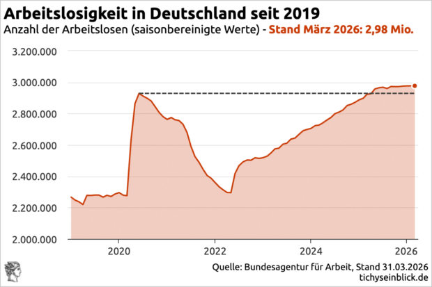 Die Arbeitslosenzahl stieg im März 2026 um 54.000. Bei der BA waren 638.000 Arbeitsstellen gemeldet, 5.000 weniger als vor einem Jahr. 1,104 Millionen Personen erhielten nach Hochrechnung der BA im März 2026 Arbeitslosengeld, 98.000 mehr als vor einem Jahr. Erwerbsfähige „Bürgergeldberechtigte“ waren hochgerechnet 3,820 Millionen.