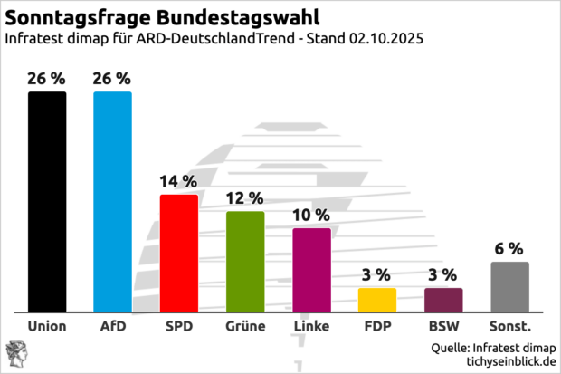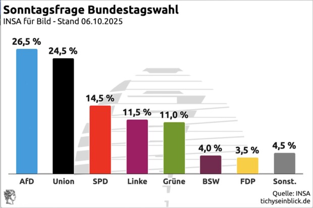 Was würde es denn bedeuten, wenn die schwarz-rote Schuldenkoalition keine Mehrheit mehr hätte? Antwort: Gar nichts. Die würden die Grünen ins Boot holen und dann könnte das links-grüne Kartell munter weitermachen mit seiner zerstörerischen und bürgerfeindlichen Politik. Die Meinungs- und Wahlumfragen zeigen immer noch eine stabile Mehrheit für das Kartell. Offenkundig können die mehrheitlich links-grün gehirngewaschenen Untertanen nicht genug davon bekommen, ausgeplündert und entrechtet zu werden. Im Land der naiven und denkfaulen Duckmäuser wird die Talfahrt munter weitergehen, sie ist sogar demokratisch legitimiert.