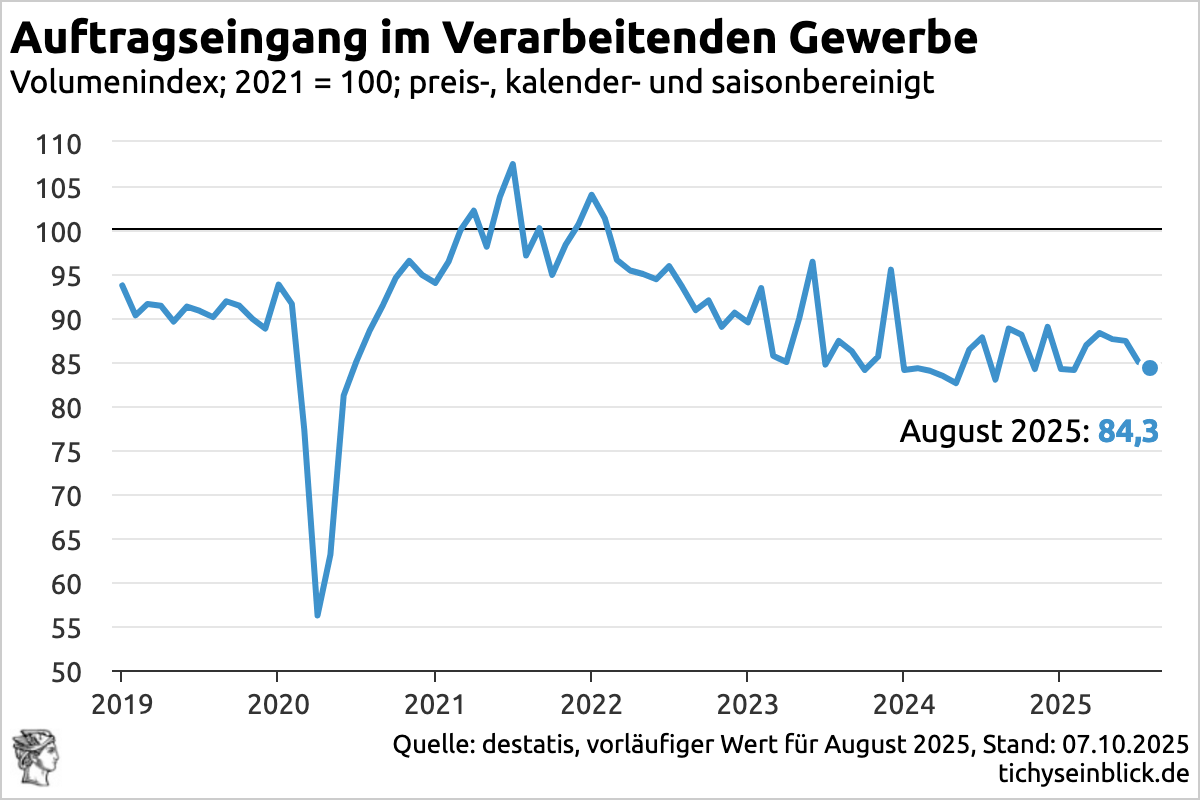 Der reale (preisbereinigte) Auftragseingang im Verarbeitenden Gewerbe sank laut Destatis im August 2025 gegenüber Juli 2025 saison- und kalenderbereinigt um 0,8 Prozent. Ohne die Berücksichtigung von Großaufträgen war der Auftragseingang um 3,3 % niedriger als im Vormonat.