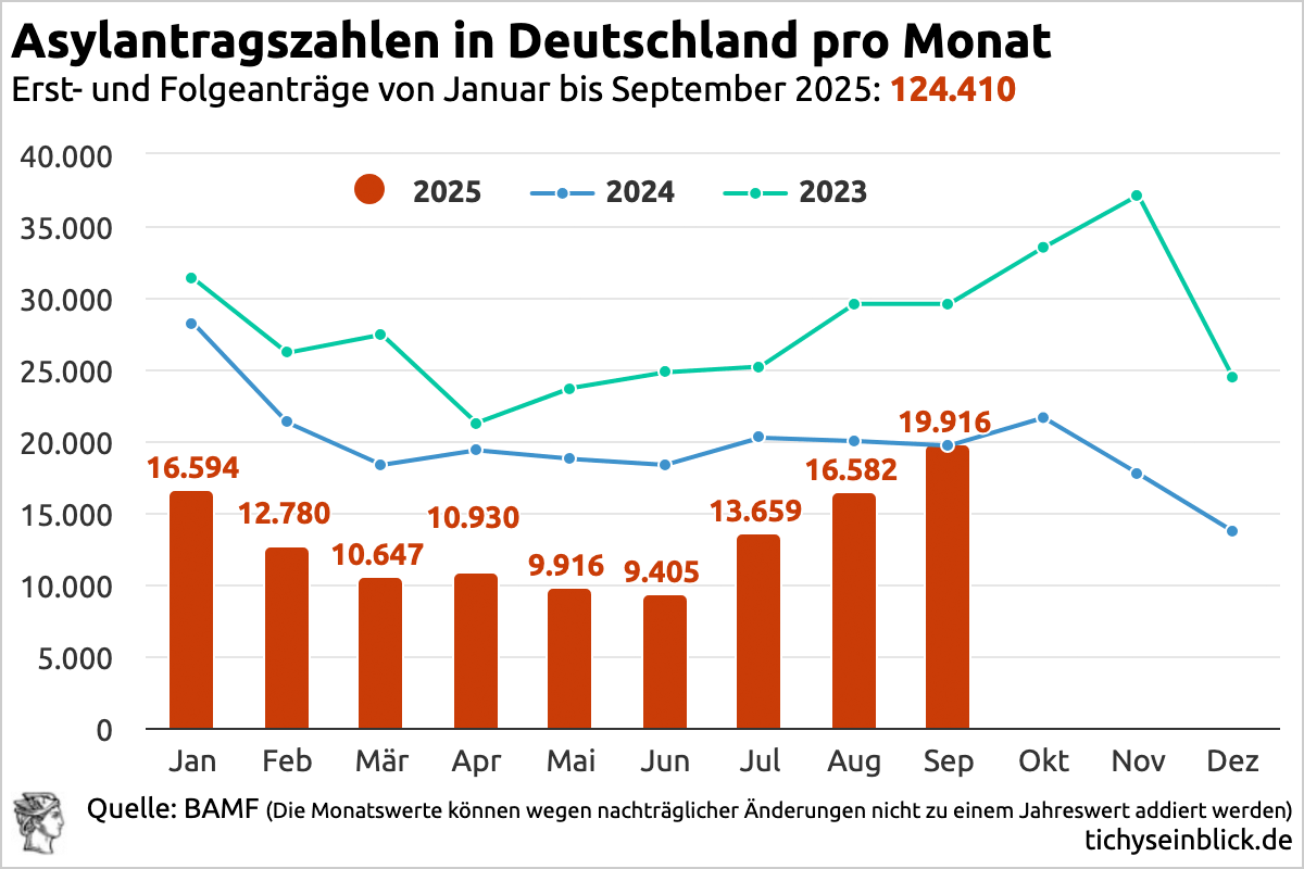 > Die Anzahl der Asylanträge war diese Jahr unter dem Durchschnitt von 2024 und 2023, stieg aber ab Juni wieder stark an.