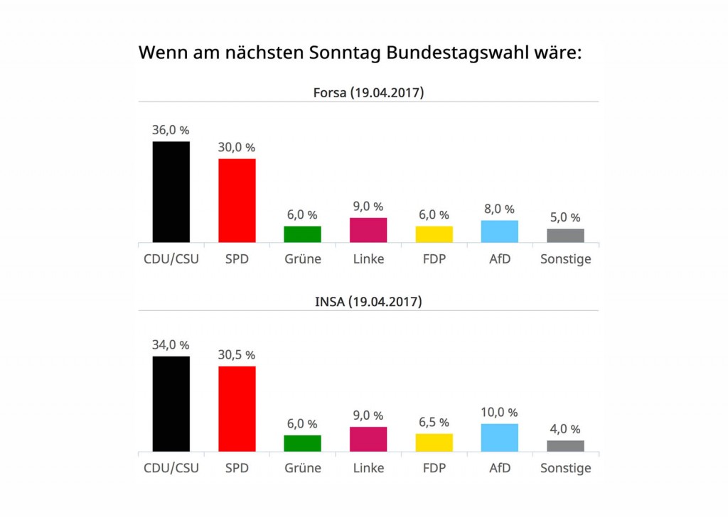Die FDP zeigten die Institute mehrheitlich lange eher unter als über 5 Prozent. Seit die AfD von Umfragewerten um die 15 Prozent nach unten sinkt, scheint der Wiedereinzug der FDP in den Bundestag sicherer zu werden. Praktisch gleichzeitig sinken auch die Umfragezíffern für die Grünen. Die Gründe für beide Trends (ich weiß, mit dem Wort muss man vorsichtig sein) sind umgekehrt ähnlich. Die FDP profitiert von „bürgerlichen“ Wahlberechtigten, die sich schon mit der Wahl der AfD angefreundet hatten, sich aber wegen der dortigen Entwicklungen, von denen Frau Petry in ihrem Video spricht, wieder abwenden und ersatzweise der FDP zu. Den Grünen nimmt der – wenn auch abgeschwächt – anhaltende Schulzeffekt Wahlwillige weg. Je nach Ausgang der Landtagswahlen in Nordrhein-Westfalen kann das für die Grünen bedrohlich werden.