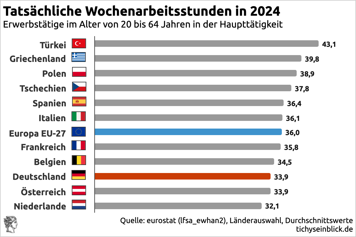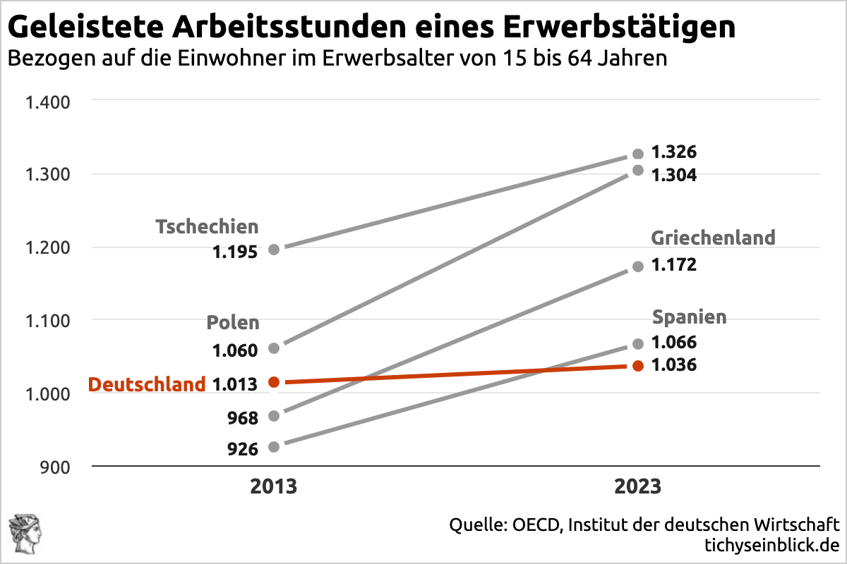 Unsere Gerichte sind schon weitgehend ideologisiert oder unterworfen. Und wenn ein Richter mal abweicht, dann wird er versetzt, muss in den Ruhestand gehen oder wird gleich ganz entlassen. Arbeitsstunden: 52 Wochen – 6 Wochen Urlaub – 1 Woche Feiertage – 4 Wochen krank: 41 Wochen x 40 Std/Wo = 1.640 Std/Jahr. Bei 38 Std/Wo. 1.558 Std/Jahr. Bei 39,8 Std/Wo sind das 1.632 Std/Jahr. Wie kommt dann Griechenland bei 39,8 Std. nur auf 1.172 Std/Jahr (72%)? Bedeutet das, dass 72% der Erwerbstätigen die maximalen 1.632 Stunden (100%) arbeiten und die restlichen 28% arbeiten nicht? Temperaturanstieg: Schade, der Herr gibt keine Quelle… Mehr
