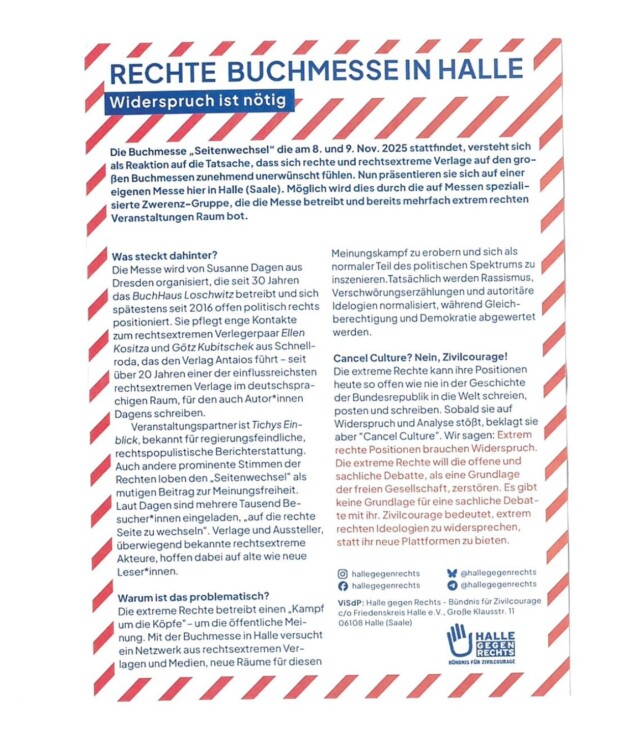 Stumpf und ohne auch nur ein Argument, warum Leser und Verlage pauschal verdächtigt werden, heißt es im Beschluss weiter: Man bekenne sich „mit der Unterstützung für das aus der Zivilgesellschaft entstandene Festival zu seiner politischen und gesellschaftlichen Verantwortung gegen Ausgrenzung, Rassismus und Menschenfeindlichkeit vorzugehen.“ Eine Begründung für diese Vorwürfe? Das erspart sich die linke Stadtratsmehrheit. Diese Verantwortung wird auch vor dem Hintergrund des Anschlags vom 9. Oktober 2019 in Halle (Saale) wahrgenommen.“ Damit wird der Buchmesse, ihren Teilnehmern und Veranstaltern eine Verantwortung für den Doppelmord mit rechtsextremen Hintergrund unterstellt.