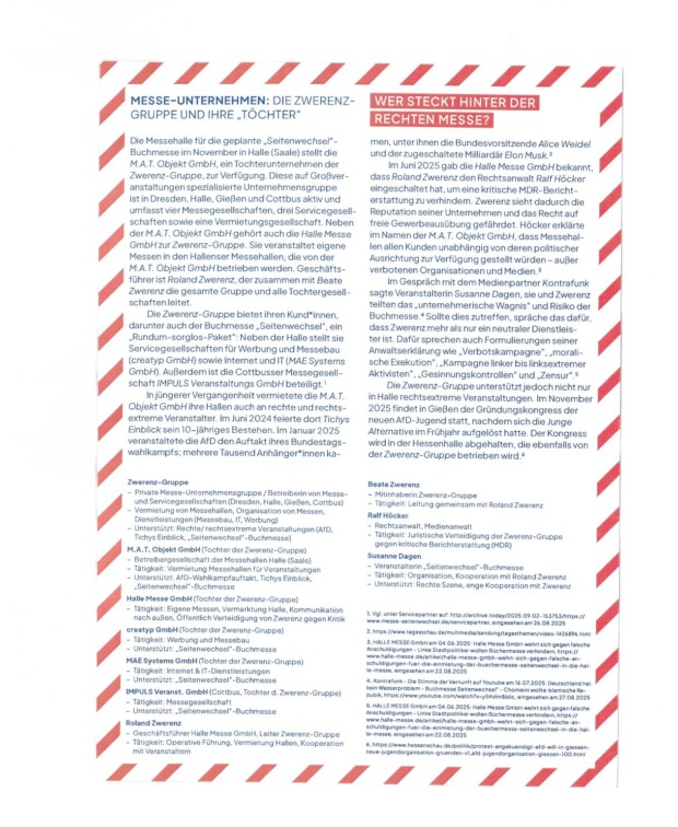 „Der Stadtrat unterstützt entschieden das WIR-Festival, das sich aus der Mitte der Zivilgesellschaft gebildet hat und begrüßt dessen geplante Initiativen und Aktionen im Kontext der Buchmesse „Seitenwechsel“ und darüber hinaus. Ferner begrüßt der Stadtrat die Vielfalt der geplanten Veranstaltungen und der Akteur:innen.“