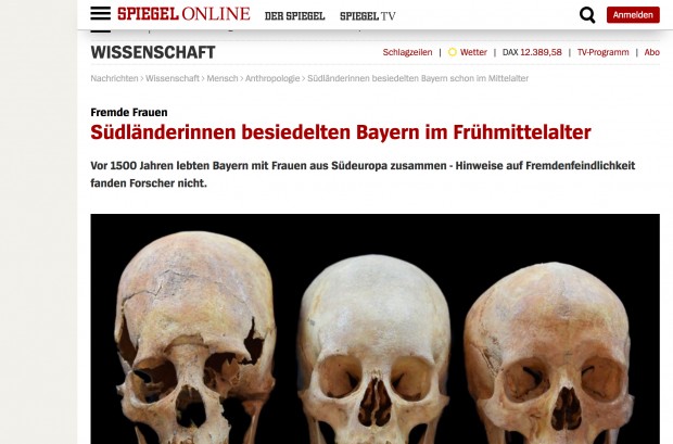 Was nun aber die Presse in Gestalt des Spiegels daraus macht, ist abenteuerlich: „Vor 1.500 Jahren lebten Bayern mit Frauen aus Südeuropa zusammen – Hinweise auf Fremdenfeindlichkeit fanden Forscher nicht.“ Nun soll also die ansonsten unbestechliche Archäologie herhalten für einen weiteren Zweig der Refugees-Welcome-Bewegung: Die Schädelvermessung als Nachweis für eine multikulturelle Tradition in Deutschland. Das erinnert nun leider fatal an die Bemühungen der Nazis, mit Schädelvermessungen das Gegenteil nachzuweisen. Die Enttäuschung war damals übrigens groß, als Hitler beispielsweise das Grab Heinrich des Löwen im Braunschweiger Dom öffnen ließ und einen recht kleinen schwarzhaarigen Herrscher vorgefunden haben soll.