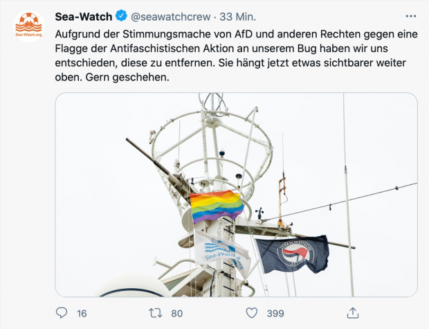 Bildschirmfoto 2021-04-08 um 16.48.10 Published on 8. April 2021 in Sea-Watch-4 hisst Antifa-FlaggeFull resolution (620 × 475) ← Previous