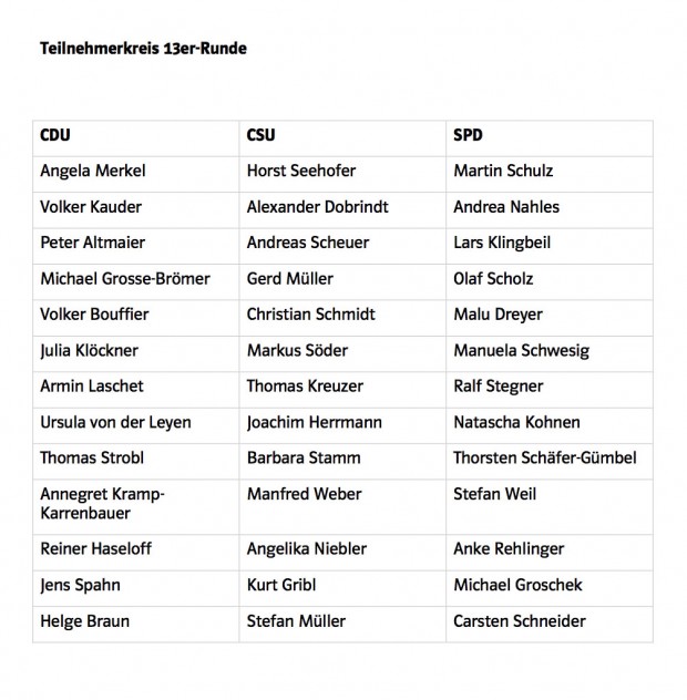 Teilnehmer_Sondierung_13er Published on 7. Januar 2018 in Sondierungen für eine kleine GroKo: Wer dabei ist und wer nichtFull resolution (620 × 632) ← Previous