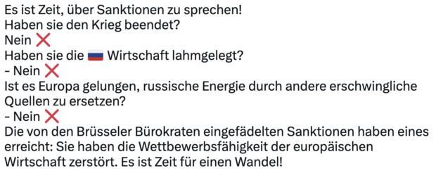 Naomi Seibt spießt EUvdL-Worte beim WEF in Davos als Öko-Marxismus auf: »Donald Trump sprach von Verdienst, Ursula von der Leyen will Gerechtigkeit. Wer wird gewinnen? Die EU-Kommission wird sich darauf konzentrieren, „die Innovationslücke zu schließen“. Dies wird den Fortschritt ersticken, anstatt mehr zu schaffen. Sozialismus tötet Innovation.«