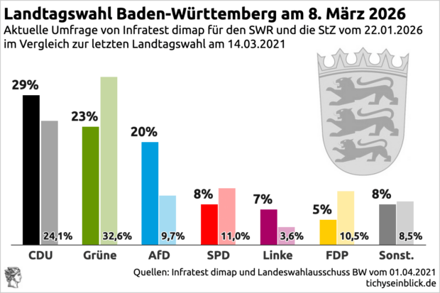 Laut YouGov wäre jeder zweite Wähler im Ländle für eine Zusammenarbeit der anderen Parteien mit der AfD, 42 Prozent lehnen das generell ab. Acht Prozent äußerten keine Meinung. Die Umfragewerte von YouGov zu den einzelnen Parteien decken sich mit denen von Infratest.