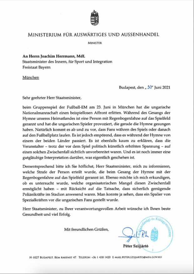 Ungarns Außenminister Péter Szijjártó hat dem bayerischen Innenminister Joachim Herrmann einen Brief geschrieben. Es geht darin um den Vorfall kurz vor dem Anpfiff des Fußball-Länderspiels Deutschland-Ungarn in München am 23. Juni, als während der ungarischen Hymne vor dem Spiel ein Mann mit einer Regenbogenfahne aufs Spielfeld rannte. Es komme zwar vor, schreibt Szijjártó, dass ein Fan auf das Spielfeld rennt, aber dass dies während der Nationalhymne eines der Teilnehmer geschehen sei, sei „empörend“. Es sei „kaum zu erklären, dass die Veranstalter – trotz der vor dem Spiel politisch künstlich erhöhten Spannung – auf einen solchen Zwischenfall sichtlich unvorbereitet waren“.