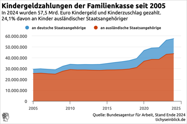 Wenn in toto 57,5 Mrd. ausgegeben wurden und 24,1% davon an Ausländer, dann müssten diese den blauen Farbton haben und die deutschen Staatsangehörigen den roten!?