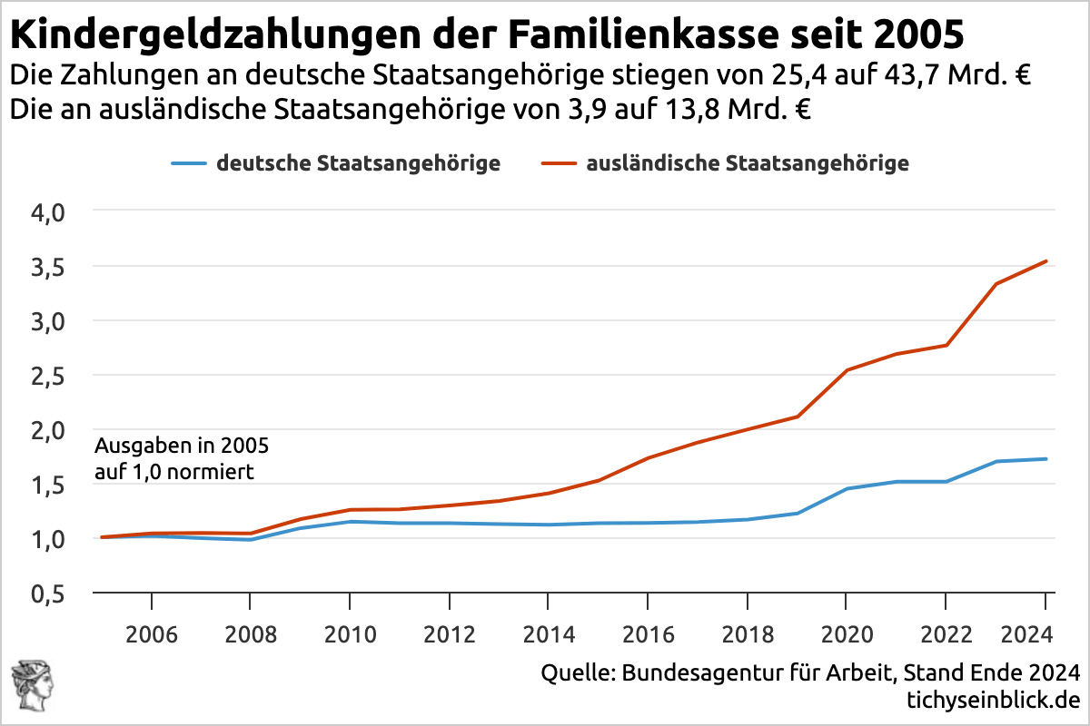 Zitat: „In der BRD kosten jene Migranten, die sich weder integrieren noch arbeiten wollen, immer mehr, die Herrschaftskaste schaut beflissen weg.“ > Man beachte in den beiden gezeigten Kindergeld-Tafeln besonders die ansteigenden Kurvenverläufe ab 2014/15 bzw. ab ~2018. Wohl wahr, welch Bereicherung. (Iro/Zynism off) _ _ _ _ _ UND wenn ich mir in obiger „Sonntagsfrage Bundestagswahl“ bei aller -nicht überschwenglicher- Freude über das AfD-Ergebnis die anderen Umfrageergebnisse angucke und dann sehe das alleine nur die roten, grünen und dunkelroten Pseudedomokraten (immer noch) ~35 Prozent der Wählerstimmen erhalten, dann fange ich mit Blick auf ein Drittel unserer Bevölkerung wirklich an… Mehr