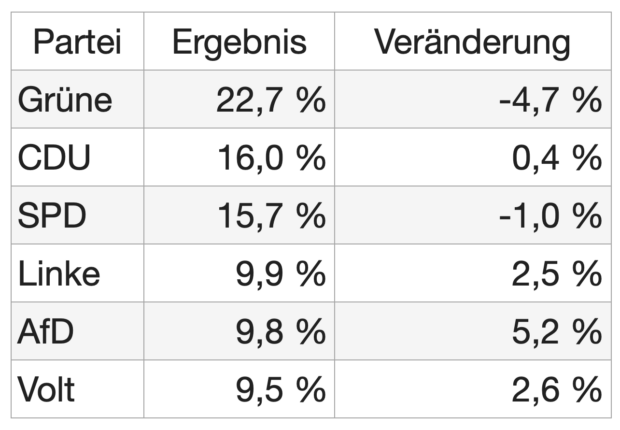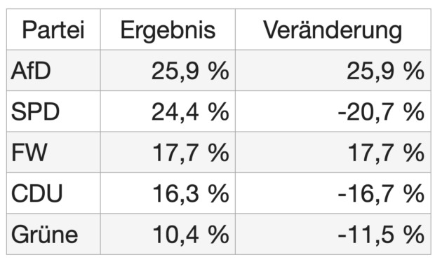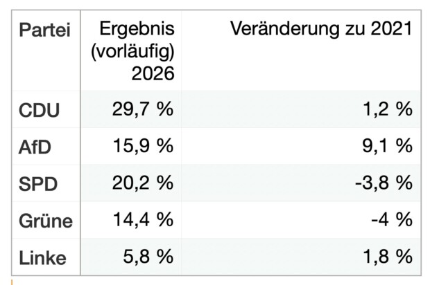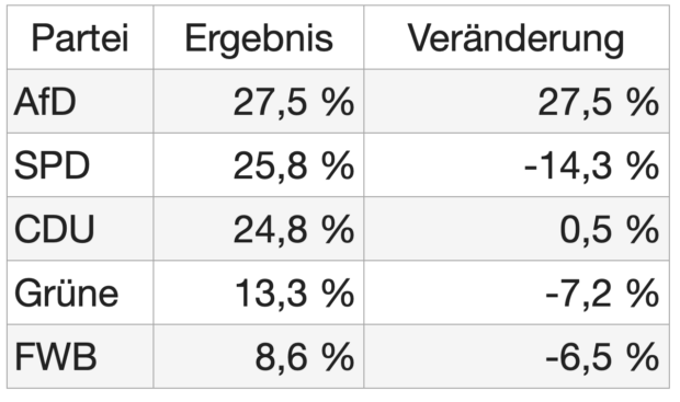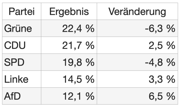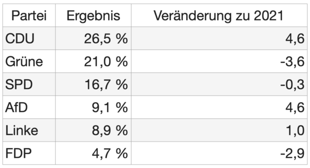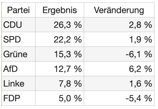 Die CDU gewinnt und ist klar stärkste Kraft. Grüne verlieren deutlich, die SPD hält ihr Ergebnis auf niedrigem Niveau. Sie ist nur noch drittstärkste Partei. Die AfD verdoppelt ihr Ergebnis.