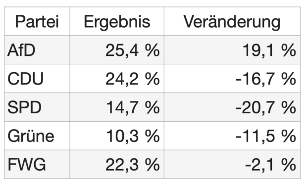 Auffallend sind die Ergebnisse in einigen kleineren Gemeinden der AfD. Hier stehen sehr hohe Verluste von CDU, SPD und Grünen außergewöhnlich hohen Gewinnen der AfD gegenüber.