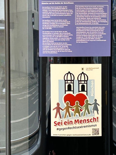 Auf der gleichen Spur wenden sich auch die Münchner Verkehrsbetriebe per Aushang an das Publikum in Bus und Bahn: „Sei ein Mensch. Gegen Rechtsextremismus“.