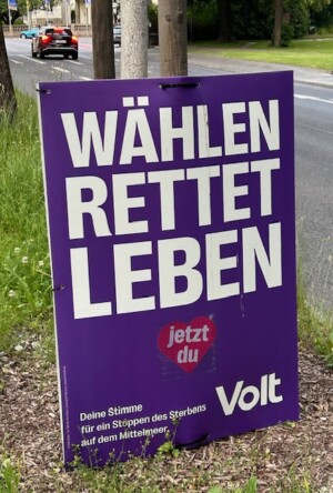 Mich hat es bei dieser Wahl nur bei einem Wahlplakat „in den Fingern gejuckt“ es zu verbessern: Volt hatte eins auf dem stand „SEI KEIN ARSCH LOCH“