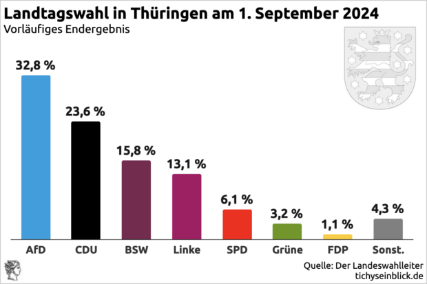 Thüringens CDU-Spitzenkandidat Mario Voigt schließt eine Zusammenarbeit mit der Linkspartei nicht mehr aus. „Wir werden das amtliche Endergebnis abwarten und dann in den nächsten Tagen in den Gremien besprechen“, sagte Voigt der Bild-Zeitung. Zuvor hatte die Linkspartei in Thüringen die Tolerierung einer CDU-Minderheitsregierung in Aussicht gestellt. In der CDU gibt es einen Beschluss, wonach eine Zusammenarbeit mit Linkspartei und AfD ausgeschlossen ist. Aber dieser Beschluss könnte bald nur noch für die AfD gelten. Nach vorläufigem Ergebnis wäre in Thüringen eine Mehrheit nur durch ein wie auch immer gestaltetes Bündnis aus CDU, BSW und Linken möglich. Die SPD ist zu klein geworden und irrelevant geworden, FDP und Grüne sind aus dem Landtag geflogen. Stärkste Kraft ist die AfD, mit der aber niemand zusammenarbeiten will.