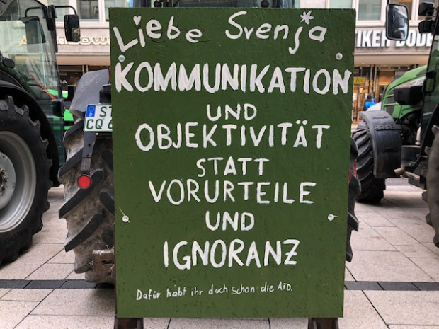 Die Bauern beklagten in ihren Reden, dass in dem Dialog zwischen Bauern und Politik seit einem Jahr bisher nur geredet, aber nichts erreicht wurde. Landwirtschaftsministerin Klöckner versuche, die Bauern auseinanderzutreiben. Eine Umweltschutzministerin Schulze, so schimpfen sie, die glaube, dass sie ihre SPD auf »unserem Rücken retten« könne, sei total falsch gewickelt.