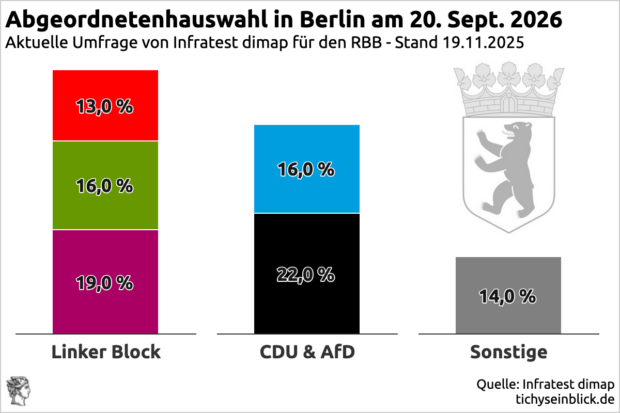 Großstädte sind schon immer Hotspots der Umstürze, weil sich dort wie in den 1920er Jahren Zukunftsvisionäre und Nonkonformisten ebenso versammeln wie Glücksritter und Schmarotzer. Die vielen Arbeitssuchenden wie damals sind heute in Berlin wie Paris und London und New York nicht dabei. Statt ihrer füllen Leute aus fremden Kulturen die Metropolen, die von Staat und Stadt mit Steuergeldern derer, die arbeiten, ausgehalten werden wollen. In diesen Tagen wurde in New York City ein bekennender Kommunist, Islamist und Dandy Bürgermeister. Die Umfrage in Berlin weist auf vergleichbar Mögliches im nächsten Jahr hin. Doch ganz anders als in NYC die Republicans gegen Mamdani wird sich in Berlin die CDU nicht gegen Rotgrünrot wenden, sondern am liebsten an deren Spitze setzen.