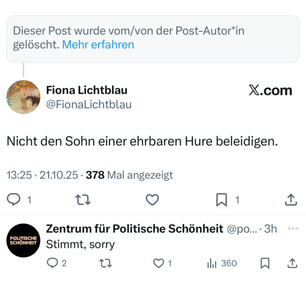 Immer wieder jene, die sich als Hüter der Moral inszenieren, greifen zum Vokabular der tiefsten Gosse. Das Zentrum für Politische Schönheit bezeichnete Kanzler Merz als "NPD-Hurensohn" und als "Rassisten"