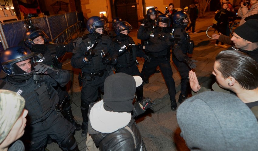 Zu Rangeleien und verbalen Auseinandersetzungen zwischen Polizisten und Gegendemonstranten kommt es am 09.02.2015 in Frankfurt am Main am Rande einer Kundgebung der islamkritischen Pegida-Bewegung (Patriotische Europäer gegen die Islamisierung des Abendlandes). Die Pegida-Anhänger sahen sich erneut mehreren tausend Gegendemonstranten gegenüber, die Polizei war mit einem massiven Kräfteaufgebot vor Ort. Foto: Boris Roessler/dpa +++(c) dpa – Bildfunk+++