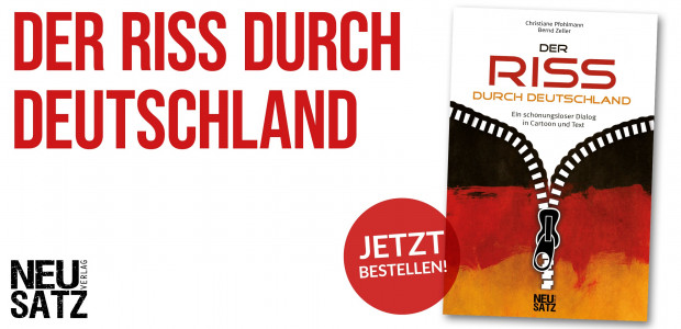 Christiane Pfohlmann/Bernd Zeller, Der Riss durch Deutschland. Ein schonungsloser Dialog in Cartoon und Text. Neusatz Verlag, 104 Seiten, vierfarbig, 15,00 €