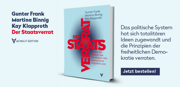 Gunter Frank / Martina Binnig / Kay Klapproth, Der Staatsverrat. Corona als Vorbote des Totalitären: Wie Deutschland aufgelöst wird. Achgut Edition, Klappenbroschur, 224 Seiten, 25,00 €.