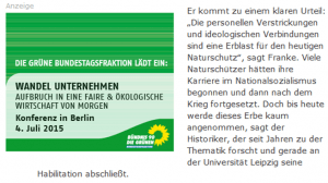 Die These vom verengten Blick rückwärts, der bei 1933 halt macht, spiegelt sich im taz-Text über die aktuelle Studie des Historikers Nils Franke „zur Rolle des Naturschutzes im Nationalsozialismus“. Den Grünen kann nicht gefallen haben, dass der Werbe-Algorithmus der taz eine Anzeige der grünen Bundestagsfraktion mitten in der Geschichte über braune Grüne platzierte. Sie zeigt, dass Männer, die sich um die Begrünung von Auschwitz und des Westwalls kümmerten, nach 1945 führende Rollen im Naturschutz spielten – in der Bundesrepublik wie in der DDR.