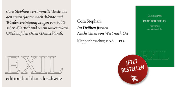 Cora Stephan, Im Drüben fischen. Nachrichten von West nach Ost. Edition EXIL im Buchhaus Loschwitz, Englische Broschur, 120 Seiten, 17,00 €.