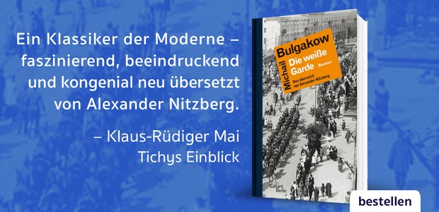 Doch zuallererst und überhaupt ist in Michail Bulgakows Werk „Die weiße Garde“, ein faszinierender, beeindruckender Roman zu entdecken. Aber man muss ihn unbedingt in der Übersetzung von Alexander Nitzberg lesen. Nitzberg glättet nicht wie andere Übersetzer die sprachlichen Eigenheiten, sondern versucht, die zuweilen seltsamen, ästhetisch gewagten Wendungen adäquat ins Deutsche zu bringen. Erst da habe ich begriffen, dass Bulgakows Erstling der Rang eines Klassikers der Moderne zukommt.