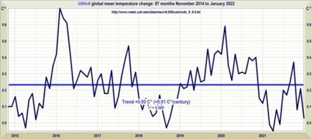 Betrachten wir zunächst die Temperaturkurve. Die Abweichung der globalen Mitteltemperatur der satellitengestützten Messungen vom Durchschnitt der Jahre 1991- 2020 fiel im Januar auf Null, genauer gesagt auf 0,03 Grad Celsius. Der mittlere Temperaturanstieg seit Beginn der Satellitenmessungen ist leicht auf 0,13 Grad Celsius pro Jahrzehnt gesunken.