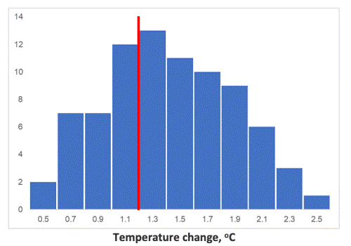 Curry kommt zu folgender Wahrscheinlichkeitsverteilung in der Temperaturentwicklung im Vergleich zum Bezugsrahmen von 1850 bis 1900. Die rote Linie ist die heutige Erwärmung von 1,2 °C. Daher bedeutet 0,4 °C auf der linken Seite der Skala eine Abkühlung um 0,8 °C gegenüber den heutigen 1,2 °C. Erwärmungen über 2 °C haben demnach eine Wahrscheinlichkeit von weniger als 10%.