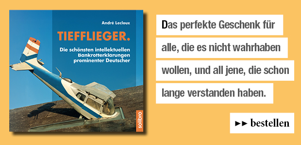 André Lecloux.Tiefflieger. Die schönsten intellektuellen Bankrotterklärungen prominenter Deutscher. Solibro Verlag, Hardcover, 144 Seiten, Preis 28,00 €