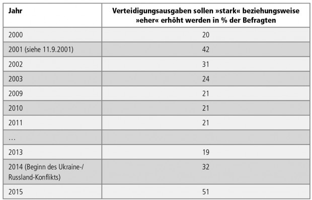 Solche Entwicklungen sind einerseits Symptom, andererseits Verstärker einer eigenartigen Entwicklung. Die Einstellungs- und Meinungsforschung ist zwar hier nicht einhellig, aber die Tendenz ist klar: Das Ansehen der Bundeswehr und das Interesse an ihr nehmen ab. 2008 etwa war nach einer Umfrage des Sozialwissenschaftlichen Instituts der Bundeswehr die Zustimmung auf 64 Prozent gestiegen. Ob das die Bewertung rechtfertigt, das Ansehen der Bundeswehr sei besser als vermutet? Auf die Frage »Sollten die Ausgaben für die Verteidigung in Zukunft erhöht werden, sollten diese verringert werden oder sollten sie gleichbleiben?« antworteten die Befragten offenbar ohne dauerhaft festen Standpunkt. Der 11. September 2001 und die Ukraine-Krise 2014 hatten offensichtlich Auswirkungen auf das Bedrohungsgefühl.