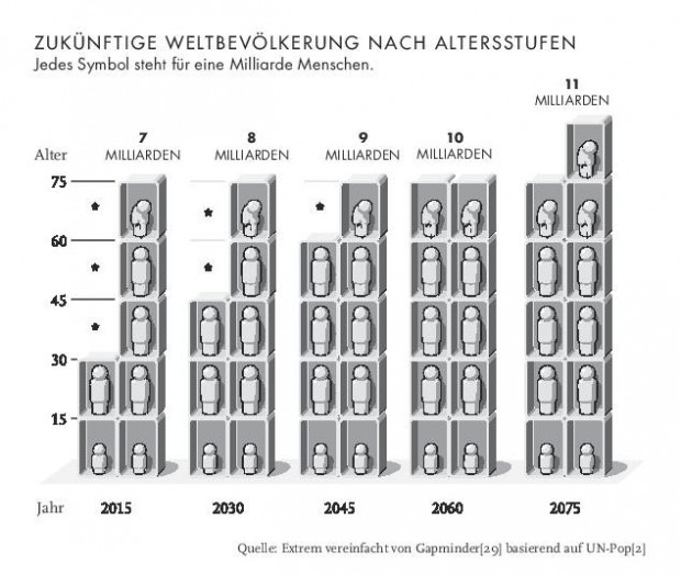 Das folgende Diagramm zeigt die nach Altersklassen aufgeteilte Weltbevölkerung im Jahr 2015 und alle 15 Jahre danach. Auf der linken Seite zeigt das Diagramm die Altersstruktur der sieben Milliarden Menschen des Jahres 2015: Zwei Milliarden sind zwischen 0 und 15 Jahre alt, zwei Milliarden zwischen 15 und 30 und jeweils eine Milliarde zwischen 30 und 45, 45 und 60 und 60 und 75.