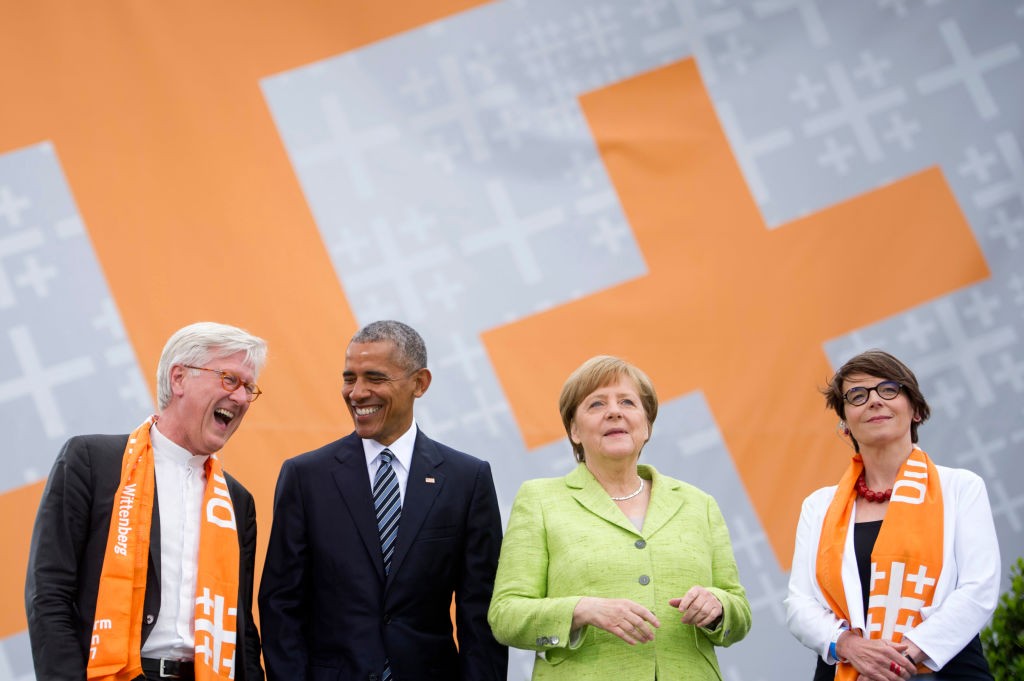 Nachdem die willigen Helferlein in den Gebührenmedien genug fleißige Vorarbeit für die Regierungspropaganda geleistet haben, ist die Stimmung bereitet für den Chef der kuriosen Parallelaktion „500 Jahre Thesenanschlag“. Der evangelische Oberpropst Bedford-Strohm (der mit dem Kreuzverstecken bei den Imams) beschwört die Agenda der notwendigen Weltrettung und lässt keine Ranschmeißparole an die Merkel-K.G-E.-Politik aus. „Luther wäre heute gegen Obergrenzen“ meint der wendige Protestanten-Chef, Kardinal Marx nickt sofort beflissen, K.G-E. strahlt begeistert und das Antlitz der Kanzlerin wird von einem inneren Licht erhellt – in den hinteren Reihen sitzt pflichtverdonnert anwesend der Horst und schaut verdrossen. Wahrscheinlich denkt er an Revanche. Und dass es mit Jamaika nichts werden kann.