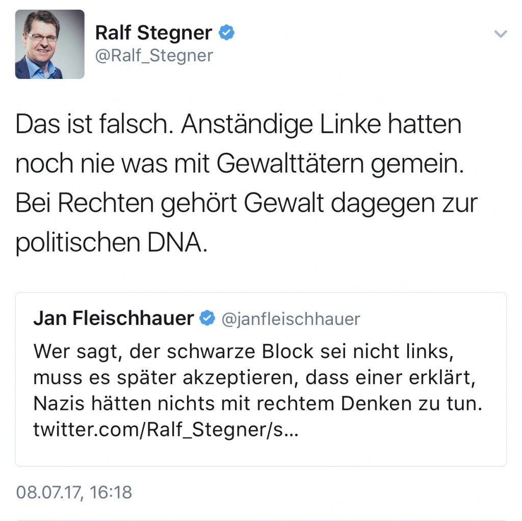 Dann beschmutzt auch noch Jan Fleischhauer das Stegner’sche Weltbild, igitt. Doch dieser setzt selbst einen Riss in sein’s, lässt seine Formulierung nun doch zu, dass es erstens „unanständige“ Linke geben kann und solche „was mit Gewalttätern gemein“ haben könnten. Ist Ralf Stegner nicht ideologiefest? Oh, oh …
