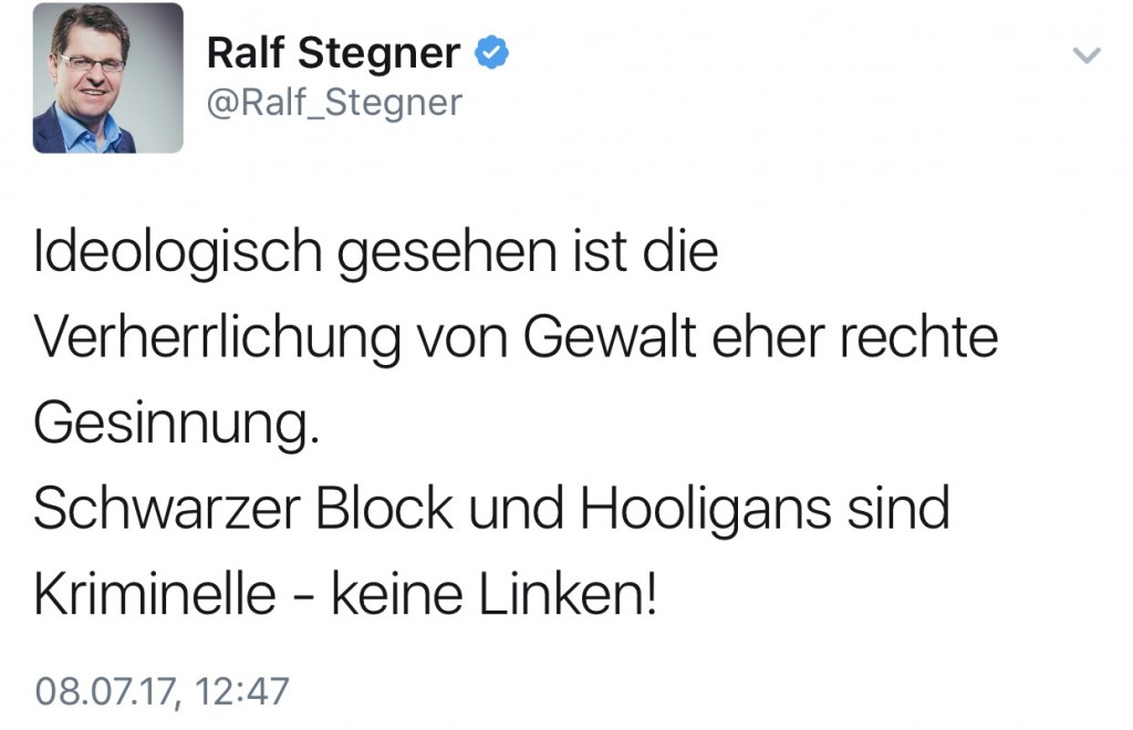 Der folgende Teil der Twitter-VHS-Kurs-Serie wirft erneut die Frage auf, ob der Dozent sich gründlich genug vorbereitet hat … „die Verherrlichung von Gewalt eher rechte Gesinnung“. „Eher“? Also ist die Verherrlichung von Gewalt auch möglich bei linker Gesinnung? Stegner, Stegner, was kommt denn da noch?