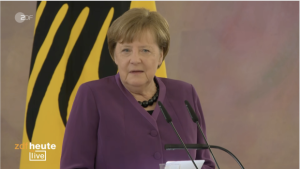 : Merkel-Biografin Ursula Weidenfeld meinte laut ZDF, Merkel habe sich bei ihrer Dankesrede listig um die Fakten gedrückt (Screenprint ZDF).Eine Jogginghose trug Angela Dorothea Merkel nicht, als sie von Steinmeier das „Großkreuz in besonderer Ausführung des Verdienstordens der Bundesrepublik Deutschland“ entgegennahm, aber ein Outfit, das dem bei der Abholung von Kuchen auffallend gleicht.