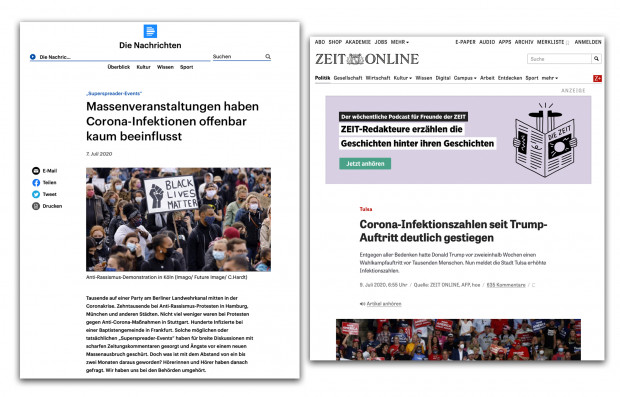 Glaubt man Medienberichten, so sorgten keinesfalls die von Hunderttausenden besuchten Black-Lives-Matter-Demonstrationen für die Verbreitung des Corona-Virus, sondern vielmehr ein Trump-Auftritt vor wenigen Tausend Anhängern. Das Virus scheint wählerisch zu sein.