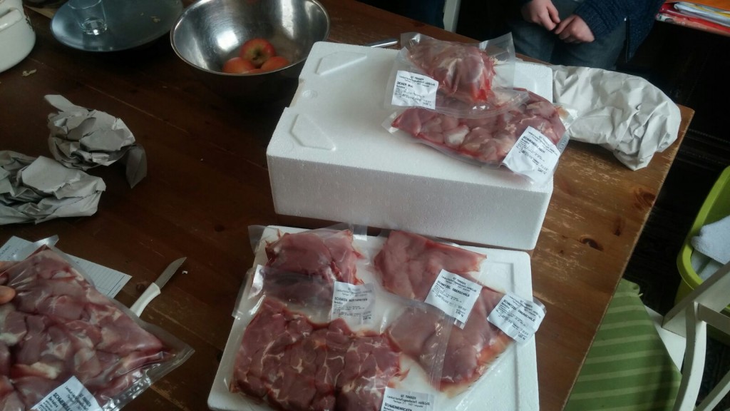 Warum? Da kam der Zufall zur Hilfe. Es begann mit 50 Euro, die ich in vorweihnachtlicher Hochstimmung einmalig in ein Fleischpaket investierte, dass man mir wenige Tage später per Kühlpaket direkt ins Haus sandte. Ich meine mich sogar zu erinnern, dass es 2-3 Kilo ausgewählte Teile vom Roten Mangalitzer Wollschwein waren. Oder war es vom Bunten Bentheimer? Auf jeden Fall um ein vielfaches teurer als die Fleischwaren aus unserem Lieblingssupermarkt und ohne diese reizenden 30%-Aufkleber.