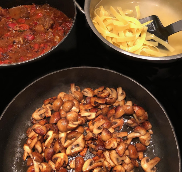 Währenddessen war ich natürlich nicht faul: Ich kümmerte mich liebevoll um die Pilzchen, die Champignons. Ich säuberte sie, schnitt sie zweimal quer durch und briet sie vorsichtig in Butter, bis sie braun waren. Sie kamen zum Schluss noch in die Sauce. Es gab dazu: Schwäbische Eier-Bandnudeln und ein kleines Sträußchen Rucola, nur mit Olivenöl benetzt.