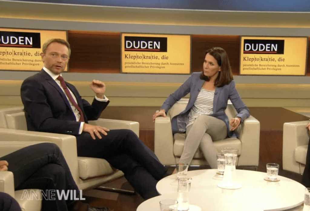Annegret Kramp-Karrenbauer, die den Schulz-Zug im Saarland als Erste zum Entgleisen brachte, sieht mit Blick auf Kommunen und Länder überhaupt wenig Spielraum für Entlastungen. Ulrike Herrmann, Wirtschaftskorrespondentin der taz, sowie Parteimitglied und ehemalige Funktionärin der mit Wirtschaftskennerinnen wie Katrin Göring-Eckardt und Claudia Roth gestraften Grünen, will auch keinen Cent hergeben. Ganz im Gegenteil, noch heute jammert sie über die rot-grünen Steuer-Entlastungen unter Kanzler Schröder. Ihr Schreckgespenst sitzt direkt neben ihr, FDP-Chef Christian Lindner.