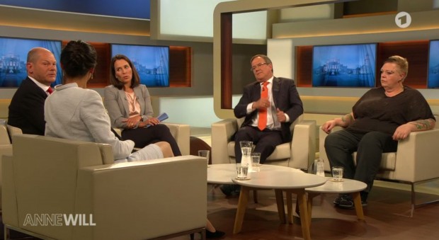 Es saßen in der Runde Olaf Scholz, Bürgermeister der Antifa-Hochburg Hamburg, Sahra Wagenknecht von der Links-Partei, deren Wirtschaftserfahrung sich aufs Erstellen von Fünf-Jahres-Plänen (dieses Jahr gibt’s Damenstrümpfe, nächstes Jahr Bananen) beschränkt, ihre Parteigenossin Maurike Maaßen und eine alleinerziehende Mutter von drei Kindern, der eine Mieterhöhung über 50 Euro ins Haus steht. Ah, dann noch Armin Laschet, der immer dann von seiner fürsorglichen Belagerungstruppe geschickt wird, wenn gerade kein anderer kann.