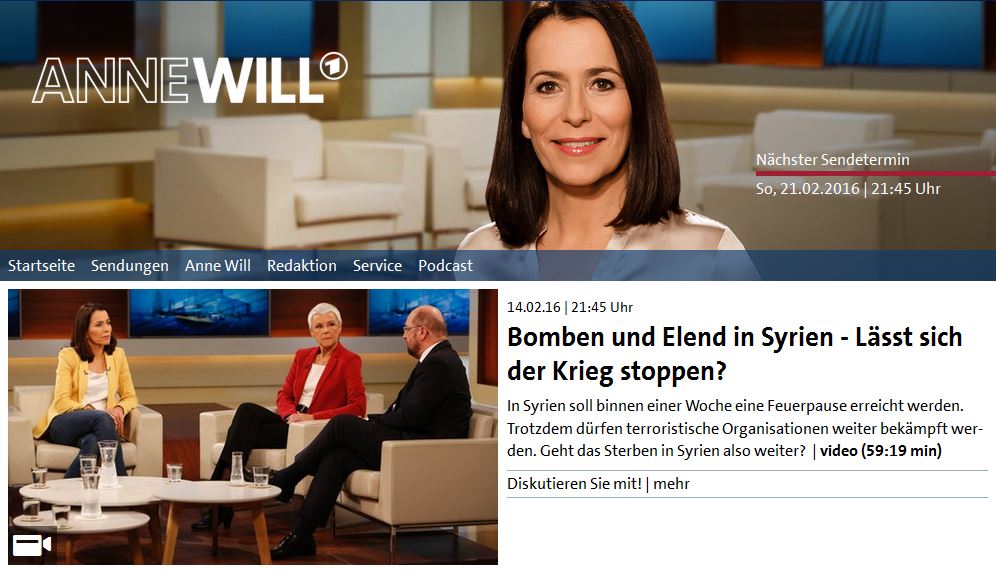 will_syrien Published on 15. Februar 2016 in Bei Anne Will: Syrien ohne PerspektiveFull resolution (996 × 572) ← Previous