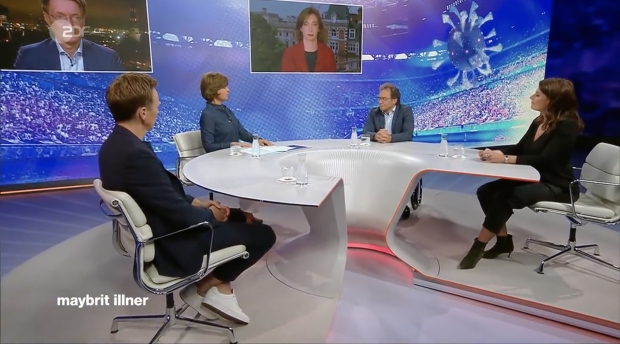 Allerdings muss Lauterbach sich dieses Mal etwas zurücknehmen, denn er ist nicht der einzige Experte im Studio mit der Lizenz zum Harwäärt-Zitat. Und Dr. Scheuch lässt sich auch nicht so schnell beirren. Die Fußballspiele sieht er als ungefährlich an, weil sie an der freien Luft stattfinden. Scheuch sagt: „In der Aerosolforschung sind wir uns relativ einig, dass draußen so gut wie keine Ansteckungen stattfinden. Das gilt auch in einem Stadion.“ Lauterbach kann nicht inhaltlich widersprechen, daher geht er die Sache bildlich an, um den Panik-Spiegel oben zu halten: „In einem Milliliter Luft sind 100 Millionen Viren“ so Lauterbach. „Mehr als Deutschland Einwohner hat. Wenn man im Stadion eng beieinander steht, singt oder schreit, kann ich mir vorstellen, dass man sich auch dort ansteckt.“