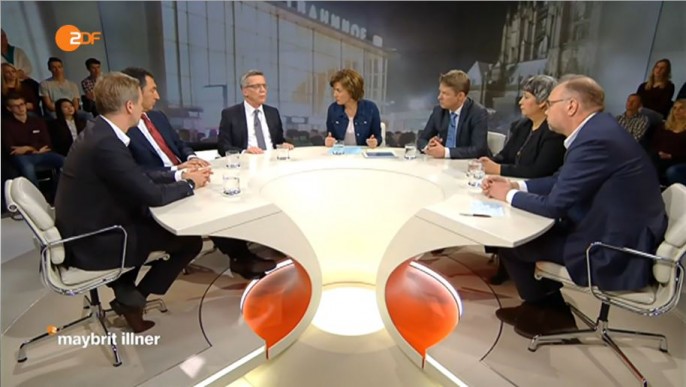 Der 70er-Bubble-Space-Schick der Studiomöblierung ist der alte geblieben. Rot-weißer, längst altbacken puristisch wirkender Newsdeckstyle. Bürostuhlatmosphäre. Maybrit lässig in Jeansjacke über leichter pastellfarbener Seidenbluse. Dünne silberne Halskette. Die Herren im Anzug. Bernd Ulrich, Stellvertretender Chefredakteur der ZEIT als einziger ohne Krawatte. Seyran Ates im dunklen Kostüm.