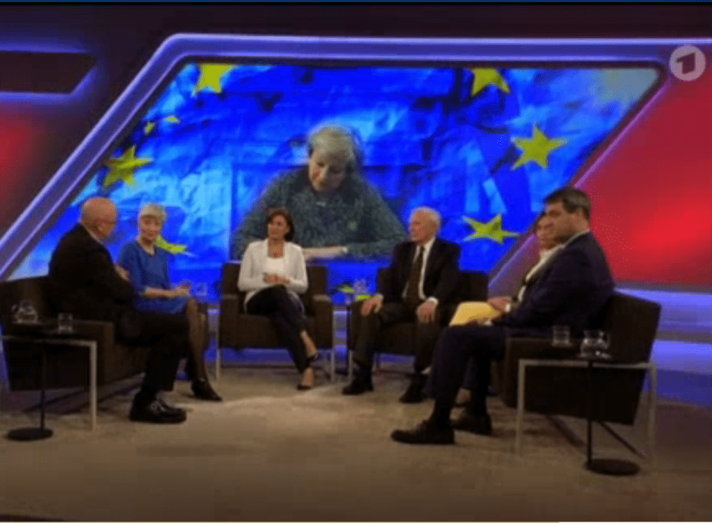Also Europa ohne Großbritannien. Im Hintergrund hatten Maischbergers Redakteure einen zerfließenden Euro drapiert, obwohl England nie den Euro hatte (zahlt Maische Mindestlohn?).